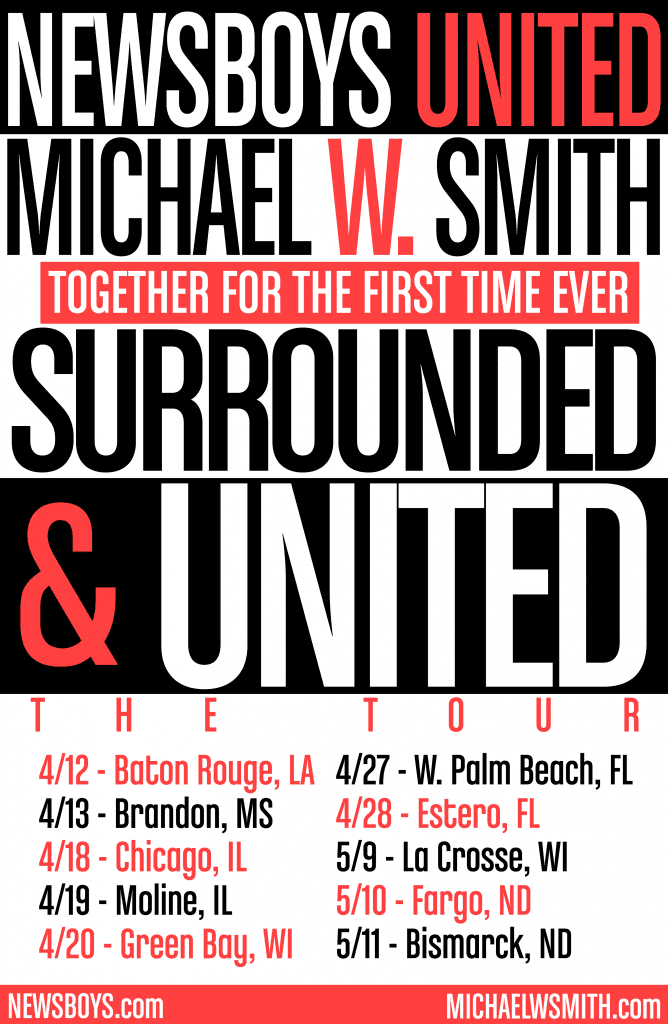 Christian music supergroup Newsboys United and multi-Platinum®, multi-GRAMMY®-winning singer/songwriter Michael W. Smith are set to make history this spring, joining forces for the first time ever for “Surrounded & United: The Tour.” The 10-city outing will be a night of worship, featuring hits spanning both artists’ unparalleled careers.